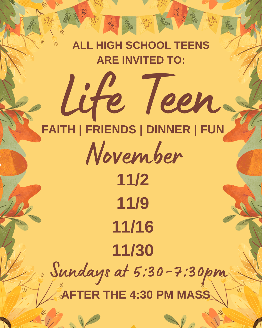 Our Heartfelt Gratitude! We extend our heartfelt gratitude to our clergy—Fr. Dermot, Fr. Josh, and Fr. Primus—as well as our dedicated staff members Kim Davis, Margaret Hofacker and Rene Bonetti. A special thanks also goes to our Life Teen Core Team: Delsie Borgen, Veronica and Ethan Pohler, Angelle Weiss, Tammy Weiss, Drew Leopard, Bernardo Castellano. Your contributions have been vital in helping our youth ministry thrive and grow this past year.